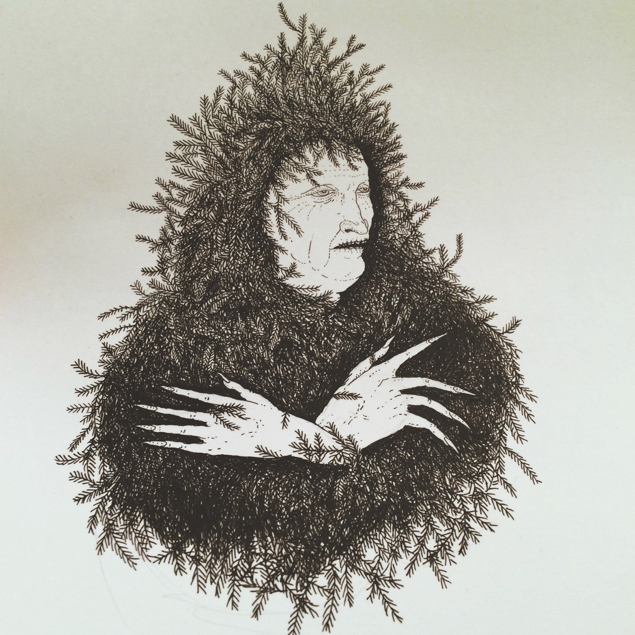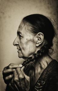 Now, I am that woman. She is beginning to surface on my own face and hands. My grandmother lived to 96, and I saw her intricately lined face as beyond beautiful. I embrace images of the old woman archetype, marked by her long life, her eyes bright with life force, even while they might be clouded with the blindness of age. The white plait down her back is a trophy of her years. She among all others is privileged with uncountable memories.